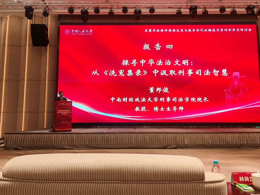 院长董邦俊教授做了题为《探寻中华法治文明:从〈洗冤集录〉中汲取刑事司法智慧》的学术报告。他指出,《洗冤集录》作为世界首部司法科学著作,蕴含“重证据实、科学断案”的精髓,其强调的现场勘验、物证检验理念,与现代刑事司法证据裁判原则高度契合。董邦俊结合书中“红油纸伞验骨”“溺亡尸体特征”等经典案例解析宋慈“审之又审”的勘查原则,并阐释其证据中心主义和人本主义的刑事司法观。