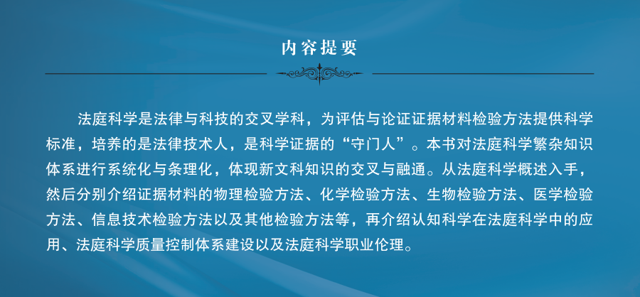 《法庭科学概论》首次以检验方法为主线进行体系化构建,依照证据材料的物理检验、化学检验、生物检验、医学检验、信息技术检验及其他检验方法分章阐述。这一创新编排体例,不仅有效整合了交叉学科知识,实现了与证据法学的顺畅对接,也助力读者建立起清晰的知识图谱。